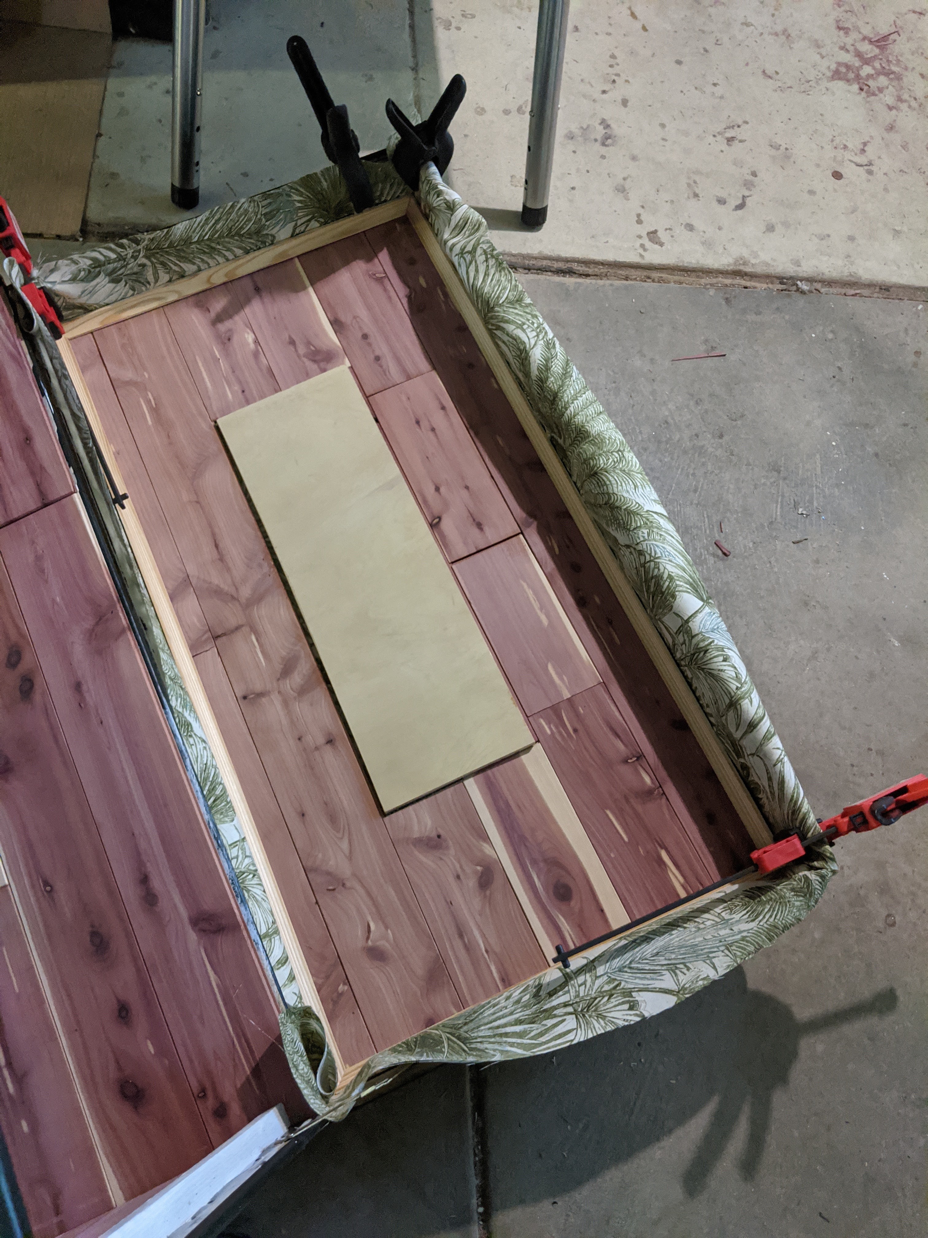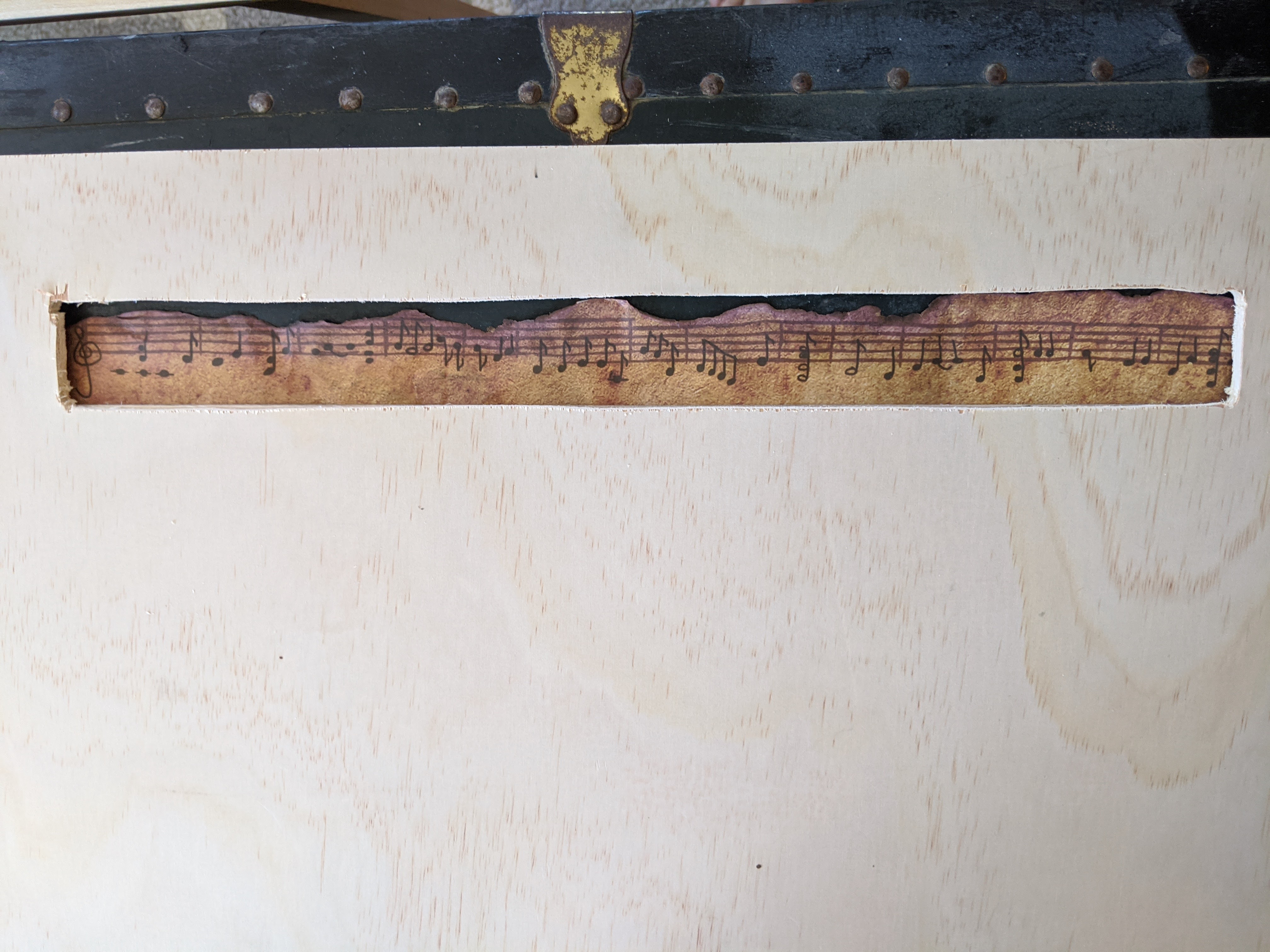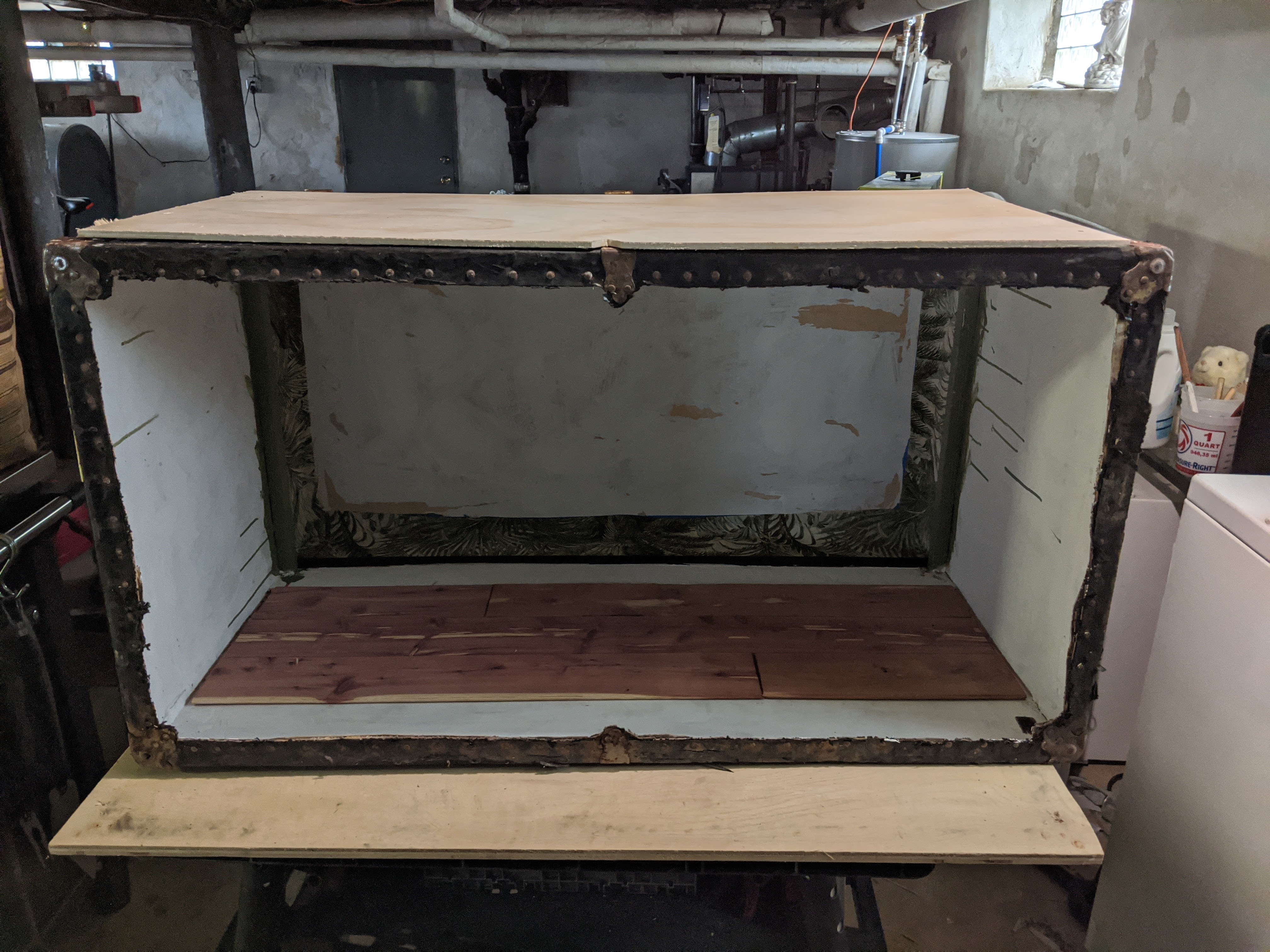 When I started hammering out details on how to address the steamer trunk, I knew I would need plywood for the bottom. I could go through the trouble of removing all the riveted bands attached to the bottom but sensibly they are all interlaced from its primary construction. I already had the plywood prior to the pandemic, but hadn’t cut it yet – now things were underway, I did that prior to cutting.