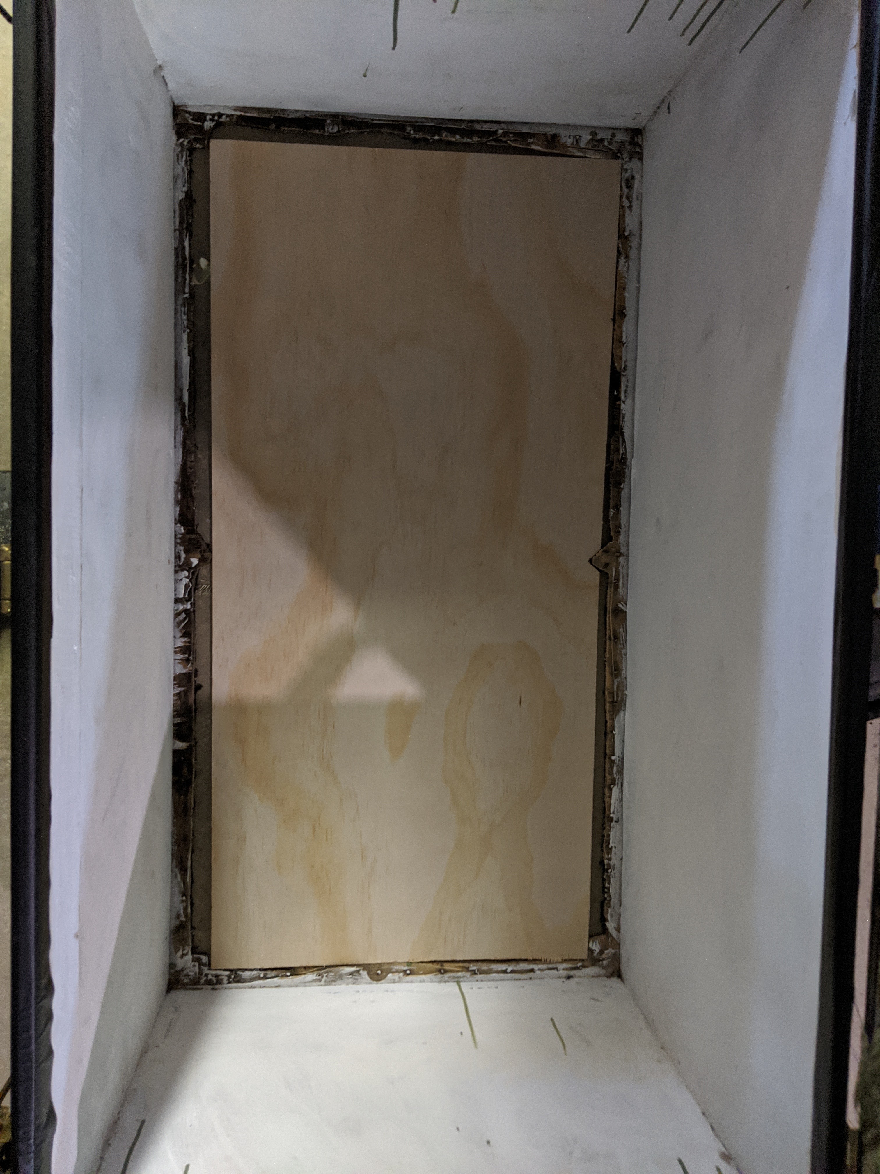 I next took on the crazy part of clearing out the damaged sections of the trunk and recover it. I busted out the jig saw and slowly but careful cut out the body of the bottom of the trunk. I didn’t take a picture of the debris that came from it but it was TERRIBLE. The water damage turned the bottom into paper machete tatters. All went into the trash.