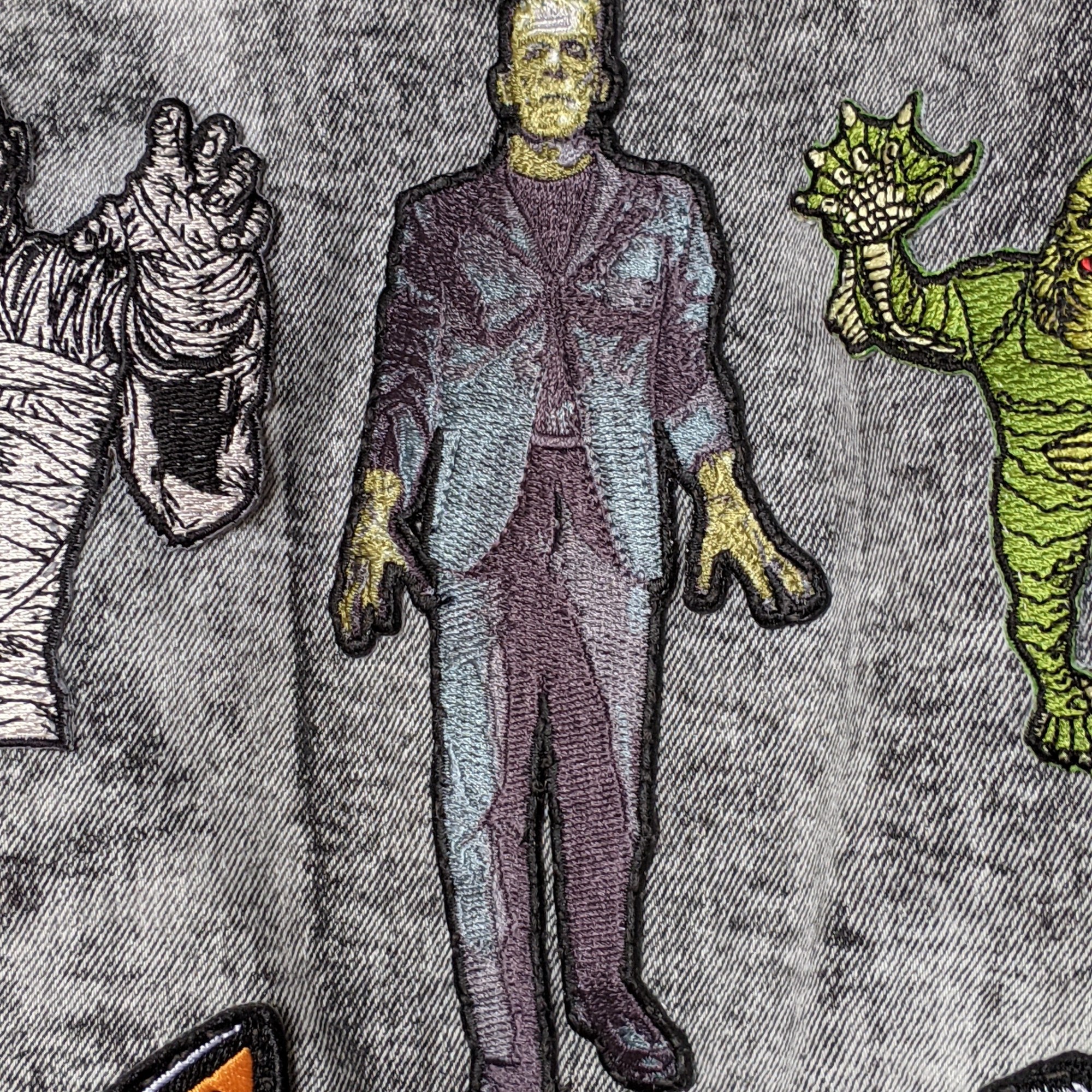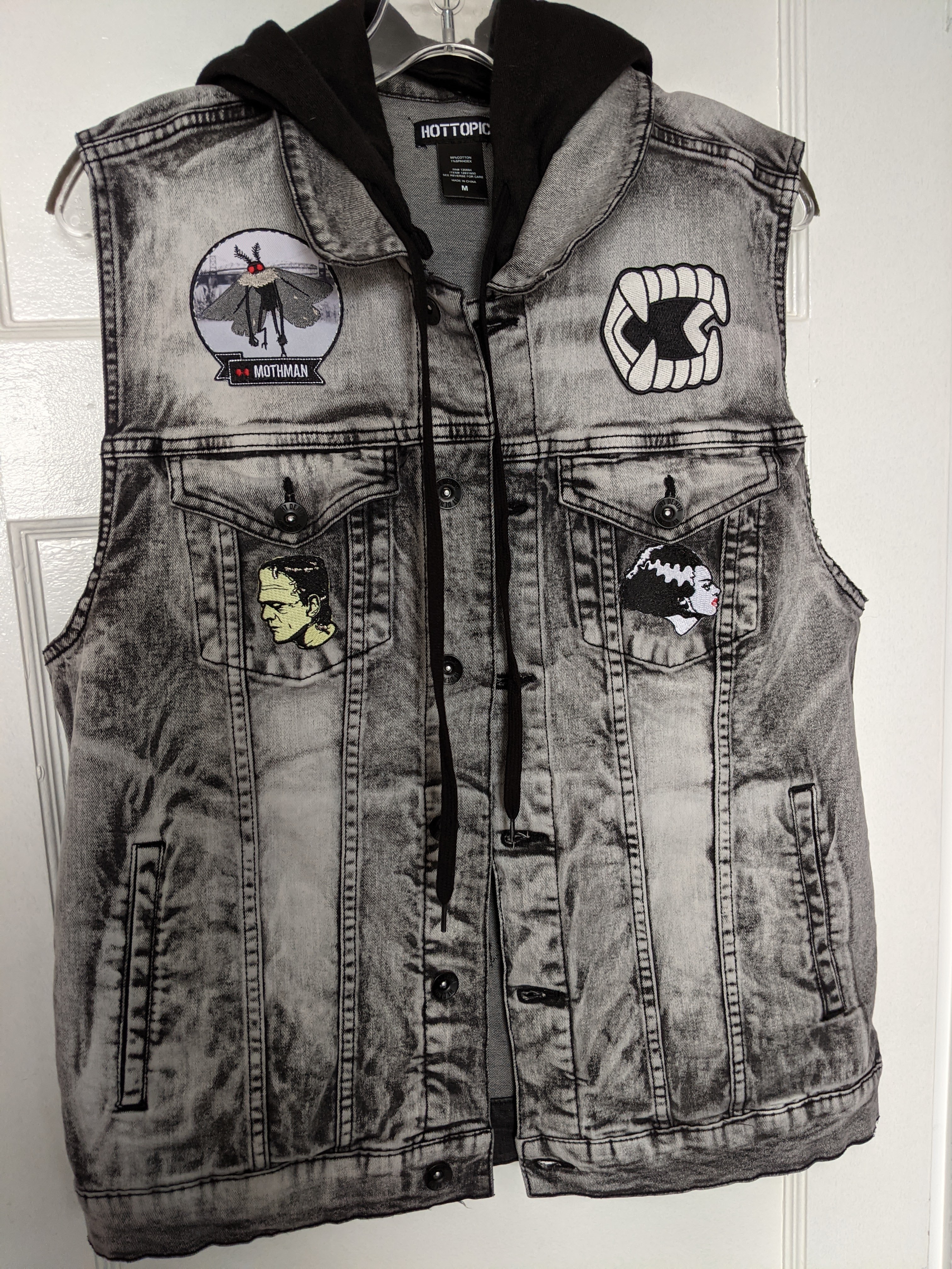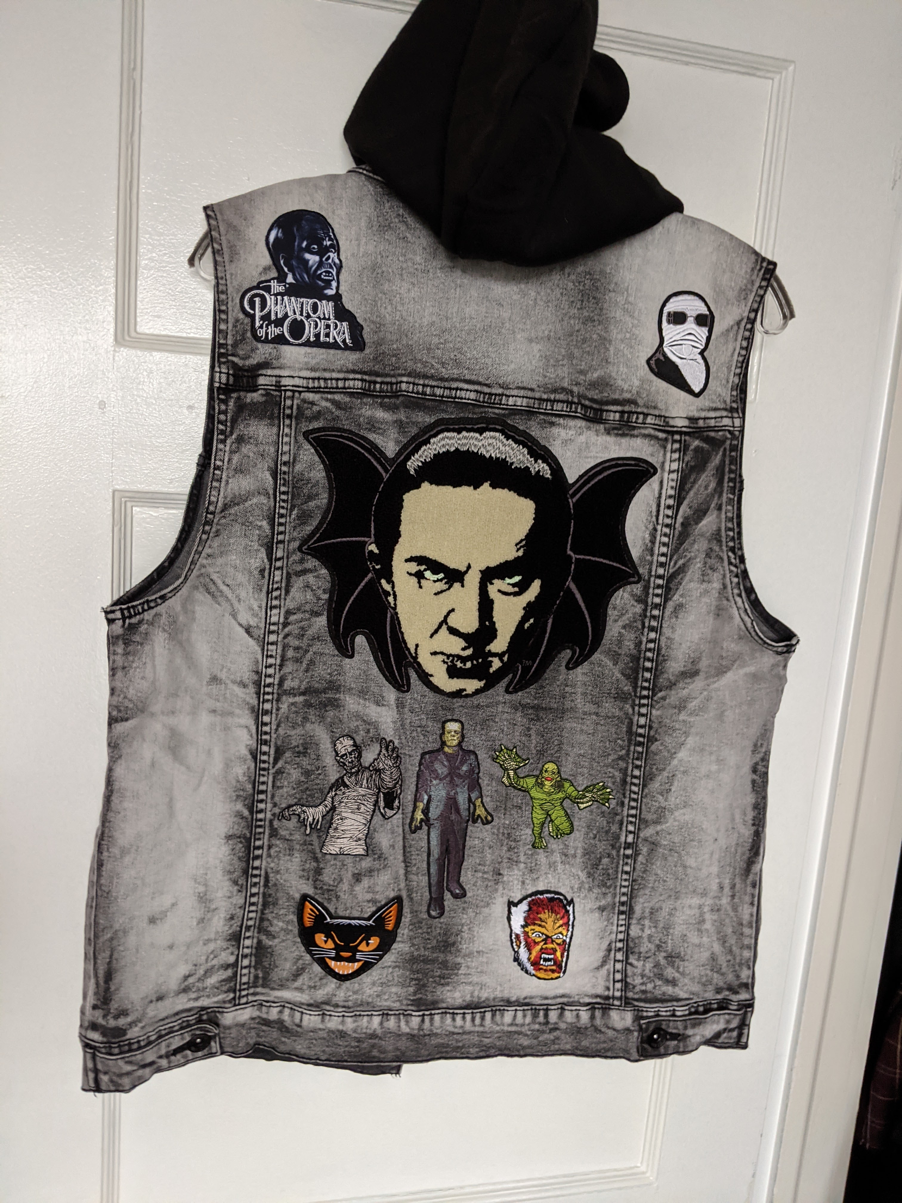So the cruel ‘Bite’ of Winter started off as almost not happening; I was on the fence about doing a fourth and final vest at the point I came onto it. Hot Topic was offering a deep discount on the vest and I kept coming back to it (not counting Facebook ads, me just not stop thinking about it). I have ALWAYS been a fan of the Universal Studios Classic Monsters of the Silver era of film; I have Frankenstein’s monster on every articles and naturally who could forget Monster Squad?