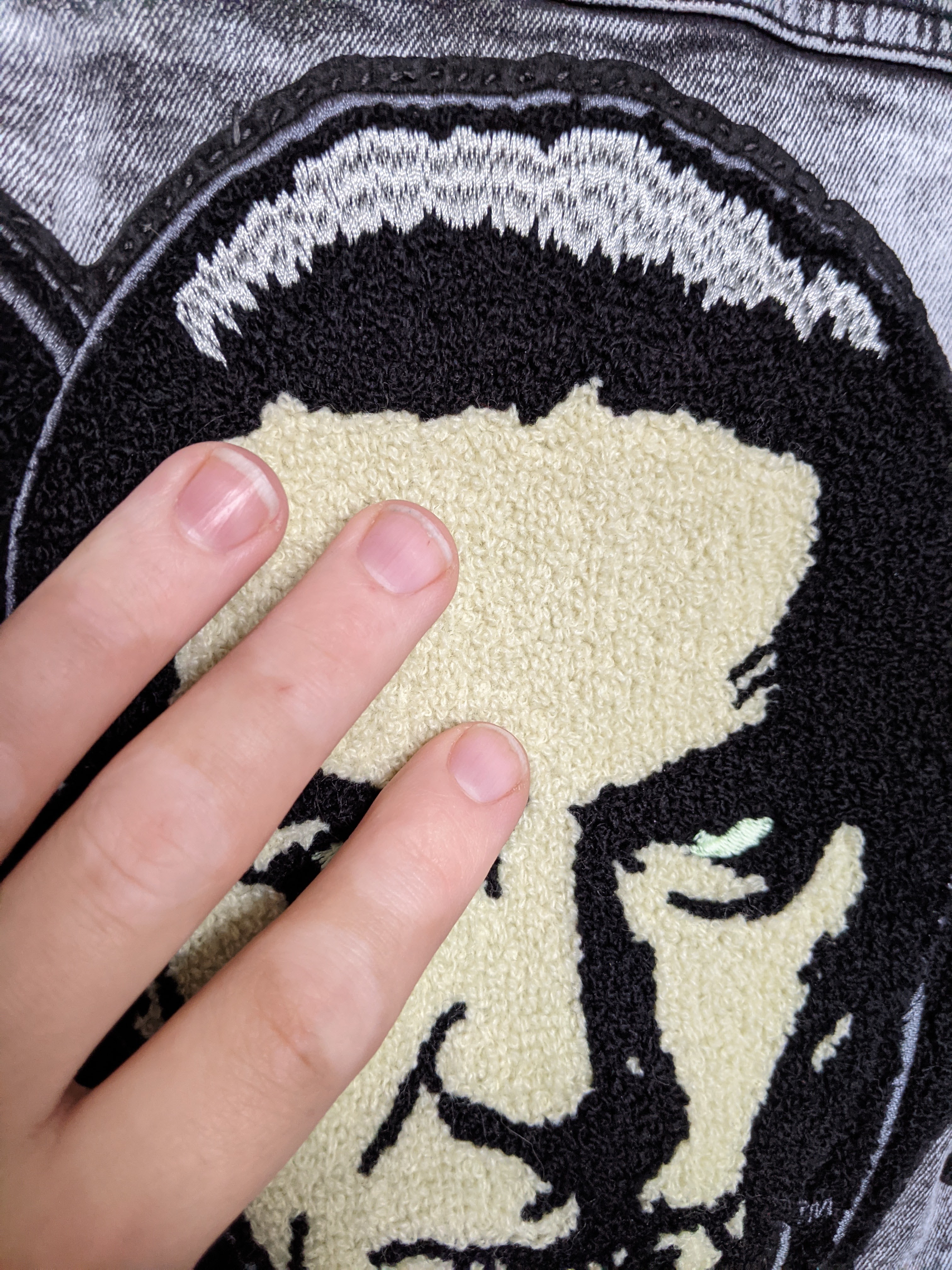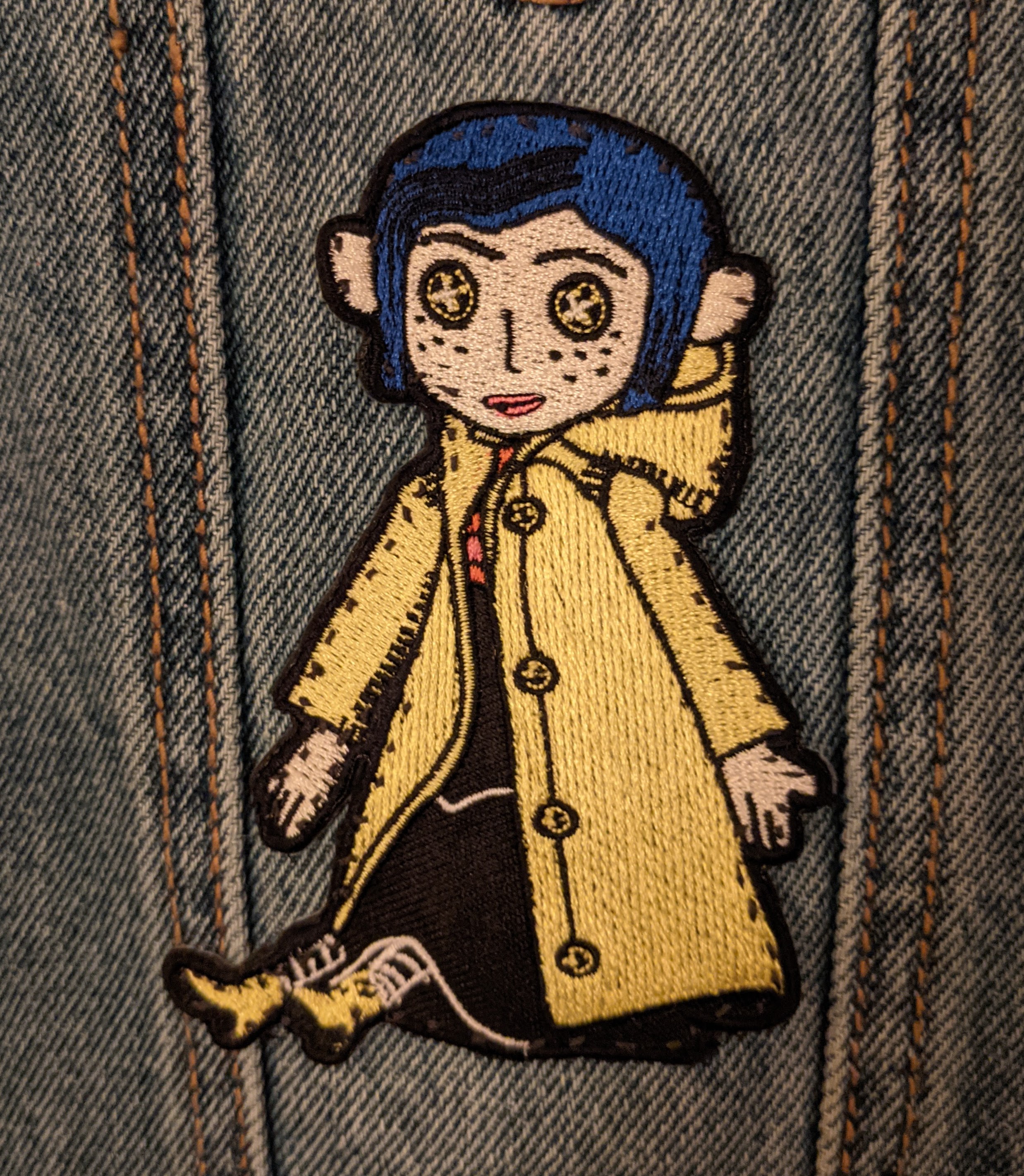 I would be remiss to not directly acknowledge the madness that is Pickle Rick and naturally Button Eyed Coraline. Pickle Rick is actually a vinyl patch, one of the few in my collection. He came to me with a velcro backing, which I had to remove in order to stitch him to the jacket. I found other options on eBay but saw this listing and took a dive on it – so very, VERY glad I did! And naturally Coraline, which is one of my favorite Tim Burton pieces, very much belongs on this piece with all the complexities that she represents about found family and being your true self.