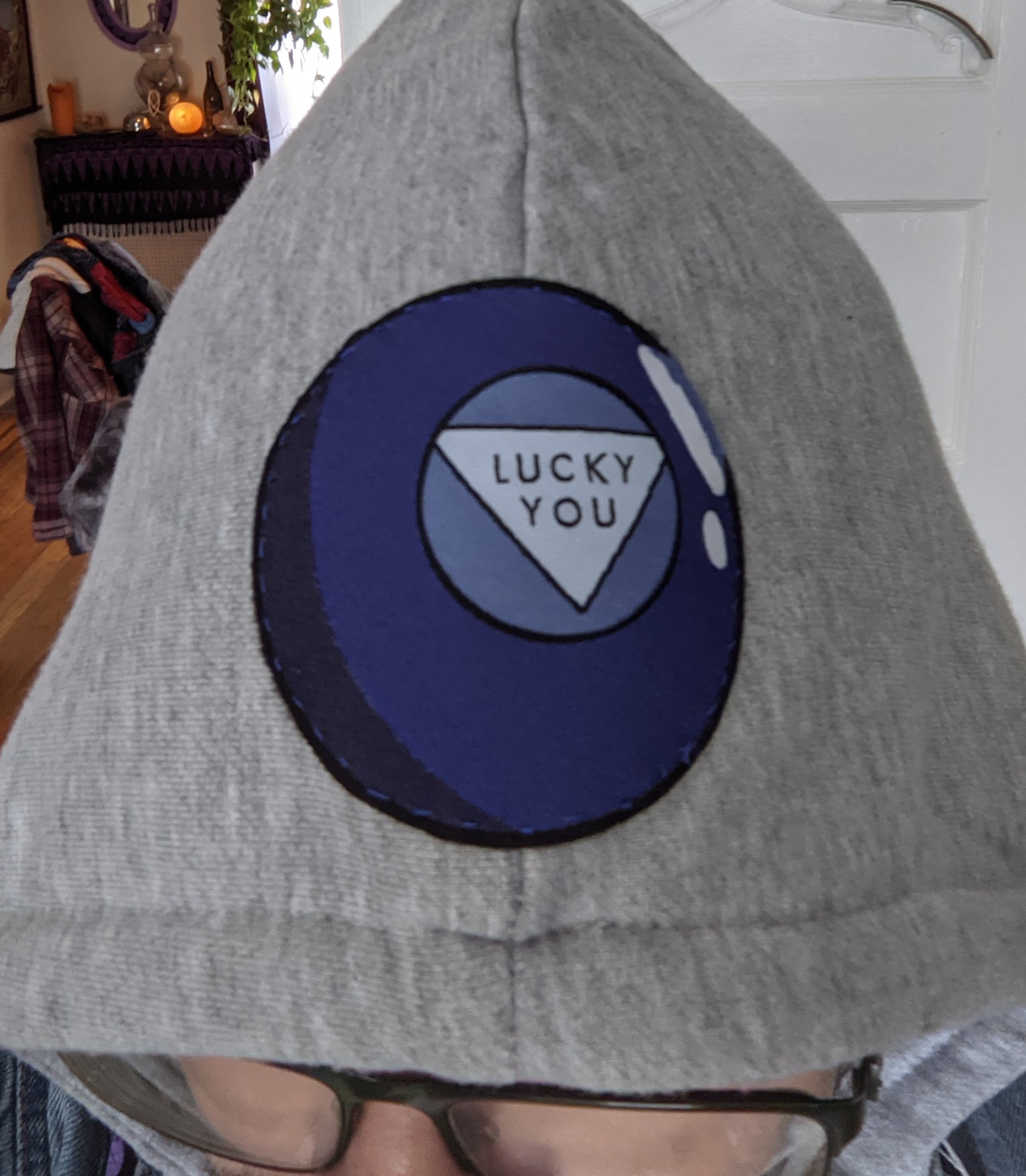 Spring is the first of two (followed by Summer) vest that has a tarot card as the right pocket designation, a “ticket” as the name plate on it, and a patch on the detachable hoodie cowl. It was a pattern that fell into place due to purchasing opportunities from Hot Topic and I capitalized on those options!