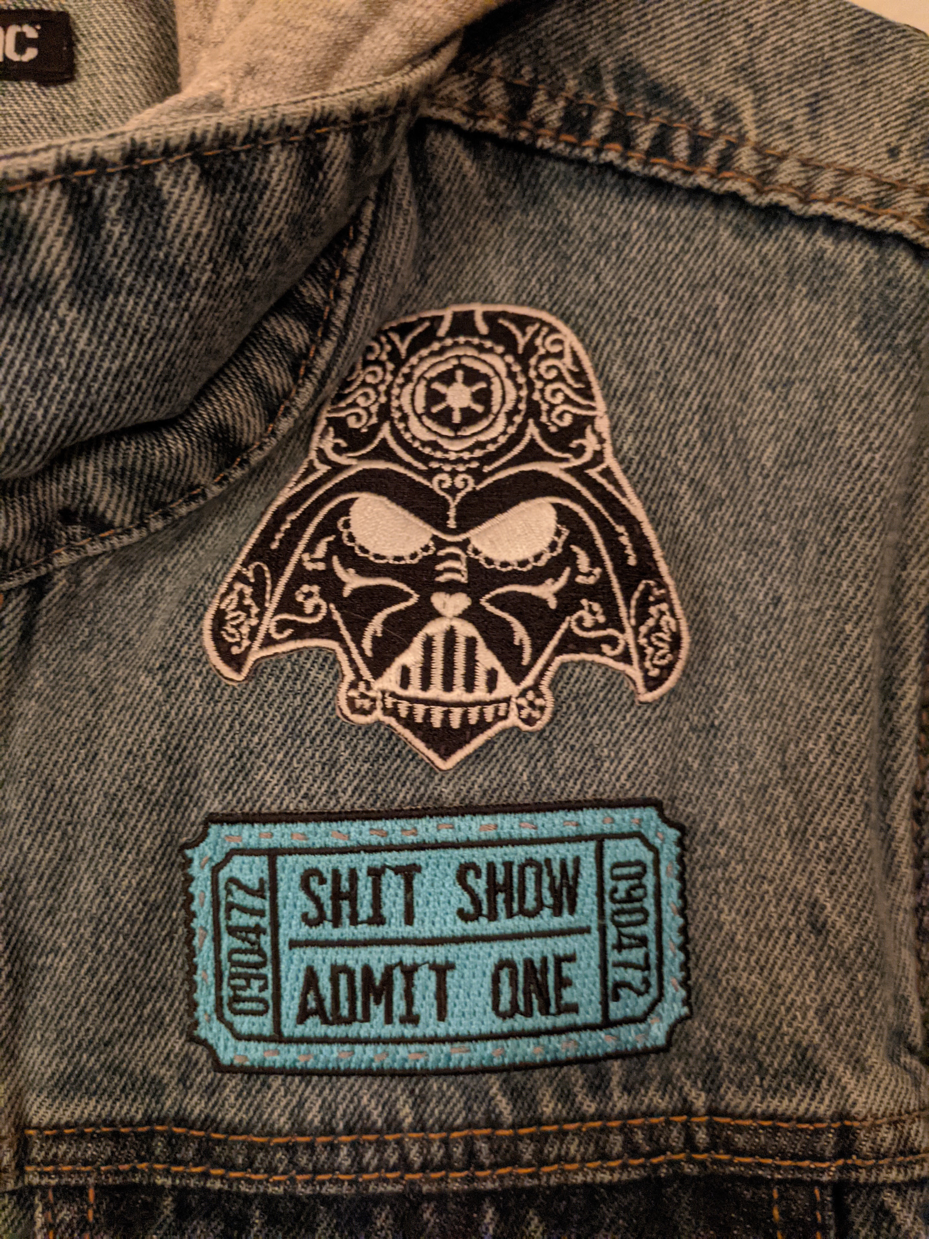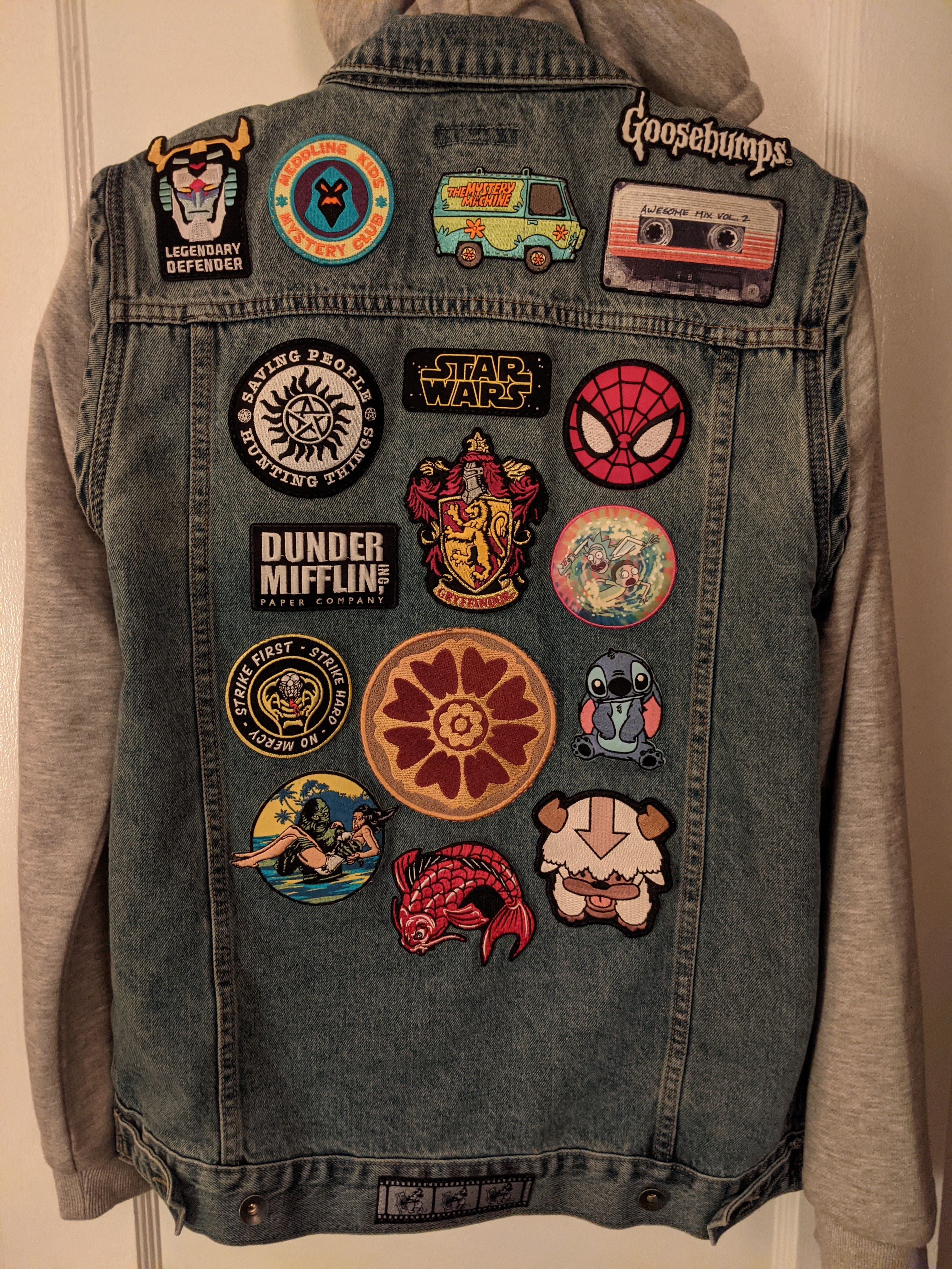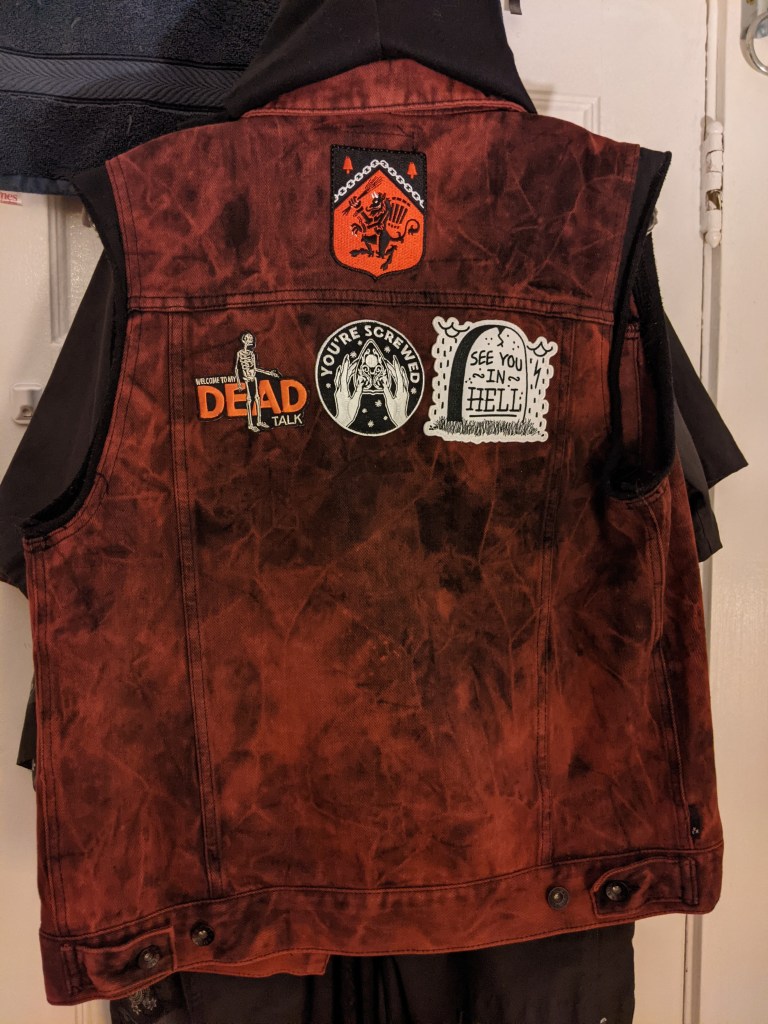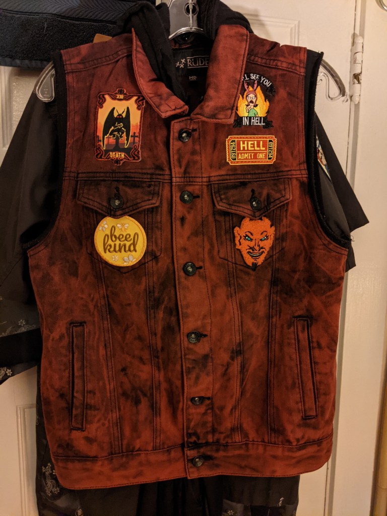 Quick introduction to this particular part of this leg of my patch work crafting – this is one of four vests/jackets I worked on from Hot Topic. Each have their own color, some have removable arms, some are just straight up denim vests.
