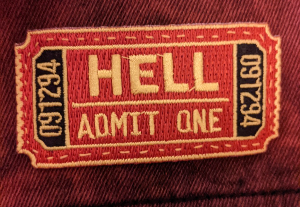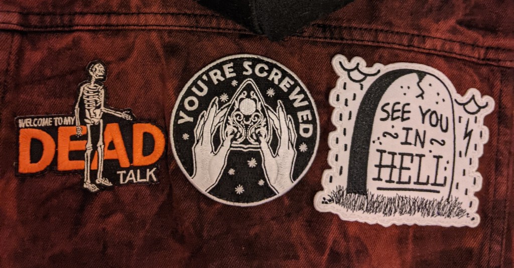 The addition of the ‘Bee Kind’ and naturally, the Devil Mask from the BEISTLE Collection at Creepy Co, it brought things towards the right directly. Be an Asshole, and be drug to Hell. Ah now it was really coming along. I had a few stray patches in my collection that didn’t have homes and I kept trying to put them somewhere, ANYWHERE but I couldn’t find the right application and didn’t want to force it. That’s because apparently I was waiting on discovering the “Welcome to my Dead Talk” from Hot Topic and suddenly I had my own little 3 cell message for my back panel: